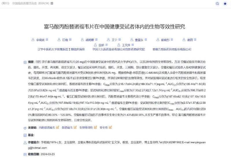 而盐酸克林霉素的文献数据,与之前国家药品监督管理局药品审评中心(CDE)公示的数据也一致。富马酸丙酚替诺福片的公示数据,目前官网尚无法查询到。不过,根据华润三九公司官网信息,其产品“富马酸丙酚替诺福韦”(TAF)片获批上市并中选国家集采,该品种注册分类为化药4类(仿制药,视同通过仿制药质量与疗效一致性评价)。根据药监局境内生产药品查询结果,华润三九只有这一款富马酸丙酚替诺福韦片。从国家药监局临床试验平台查询,华润三九也只有这一款富马酸丙酚替诺福韦片进行生物等效性测试(CTR20200796、CTR20200797),该试验的申请人为华润三九医药股份有限公司崔晓彤,亦是上述论文作者之一。