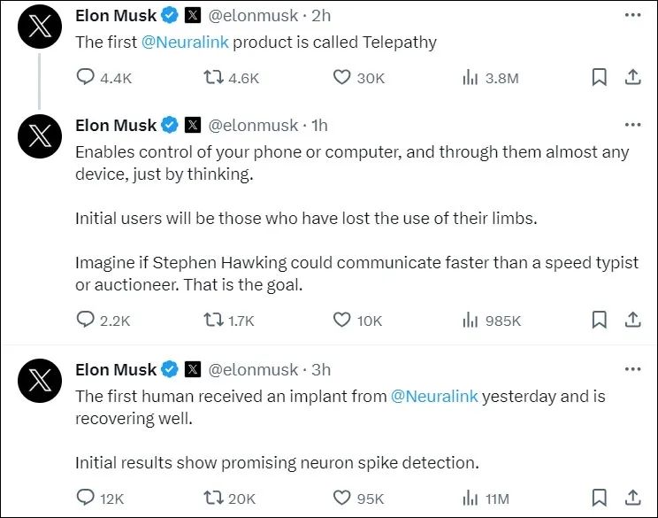 » 1. 马斯克宣布 首例人类大脑设备植入手术已完成 实验者恢复良好 more…