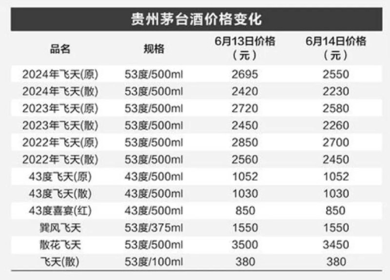 6月14日酒价数据显示,2024年出厂53度500ml的原箱飞天茅台市场价约为2550元/瓶,跌破2600元/瓶的整数关口,较前一日下跌145元/瓶;而相同年份和规格的散装飞天茅台市场价跌幅更大,现已跌至2230元/瓶,较前一日下跌190元/瓶;此外,其他年份和品种的茅台价格也出现了较大幅度的下跌。