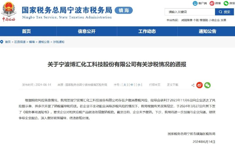 6月14日晚间,国家税务总局宁波市镇海区税务局发布通报回应称:根据税收风险筛查情况,我局发现宁波博汇化工科技股份有限公司存在少缴消费税风险,经综合研判于2023年11月6日向企业送达了风险提示单,并多次开展了纳税辅导和约谈。在企业不主动配合消除涉税风险的情况下,我局根据有关政策规定,于2024年3月27日向其下发了《税务事项通知书》,要求企业对相关应税产品依法依规缴纳税款。截至目前,企业未予缴纳。下步,我局将进一步加强与企业沟通,继续争取企业配合,深入做好政策辅导,依法依规处理。